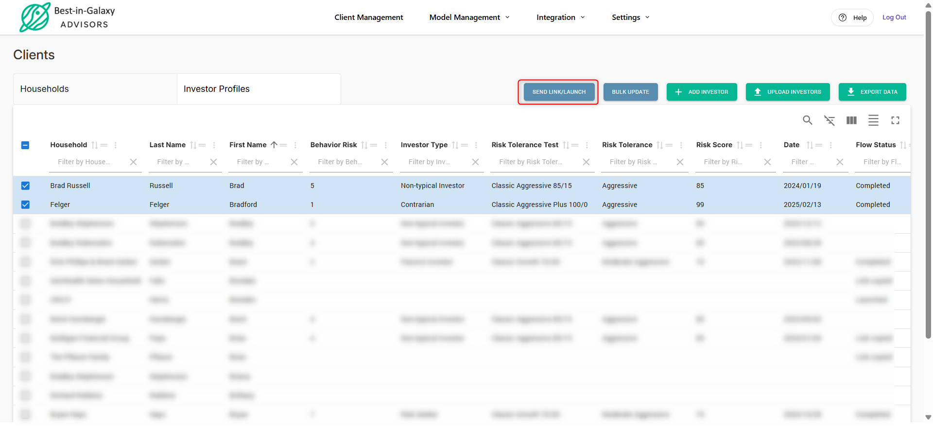 Send from the Investor Profiles tab, so from the Client Management page select the Investor Profiles tab and then tick the checkbox beside the investor’s name and then click the icon on the upper right, Send Link/Launch. You can select multiple investors.