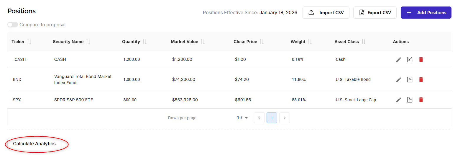 In any case, you can manually calculate analytics by selecting Calculate Analytics on the Portfolio page, located at the bottom of the Positions.
