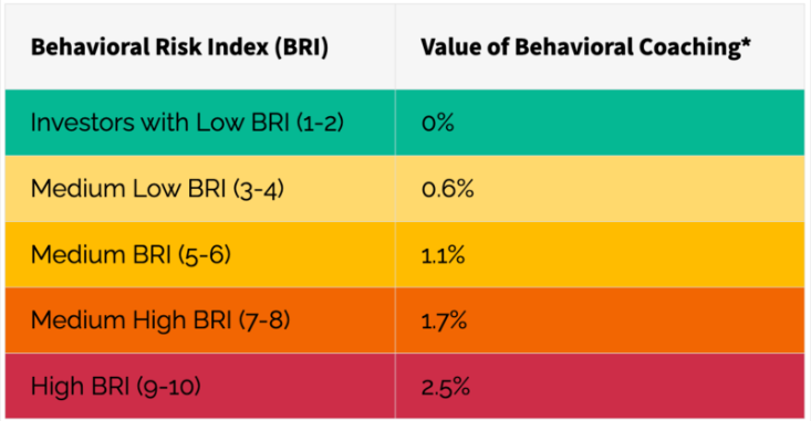 The Behavior Risk Index™ is a score from 1 to 10 that indicates an investor’s behavioral risk—the likelihood of making irrational investment decisions.