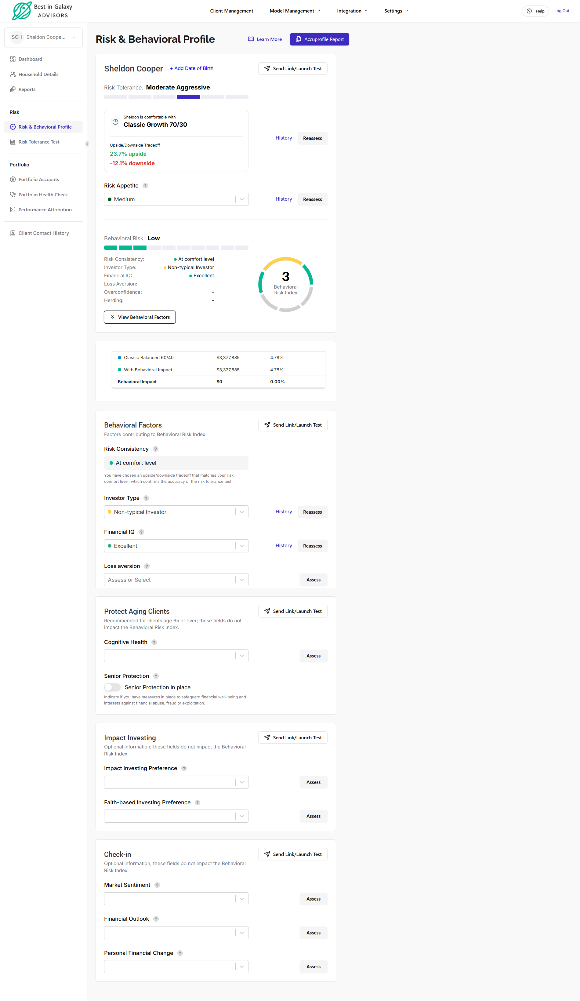 To access, open the client household and navigate to Risk → Risk & Behavioral Profile: