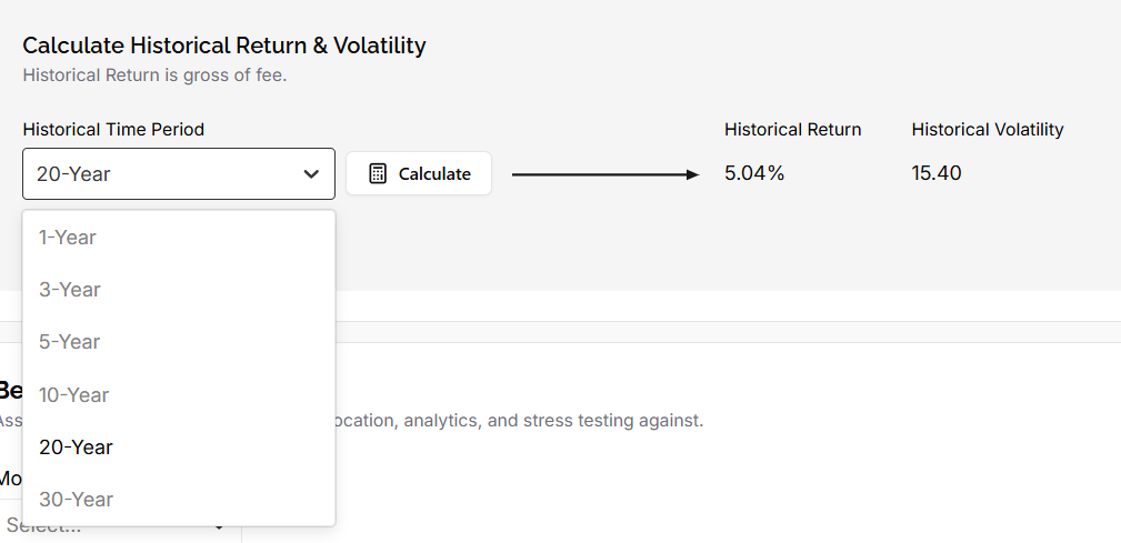 This model set includes two asset classes: U.S. Equity (represented by SPY) and Bonds (BND). The target return and volatility for each model are based on historical averages from 1986 to 2022.