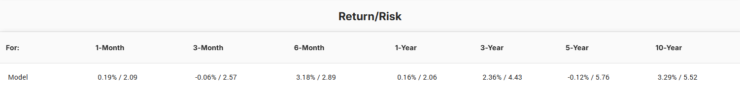 | Model Name | Model Position Weights (SPY/BND) | Target Return | Target Volatility |