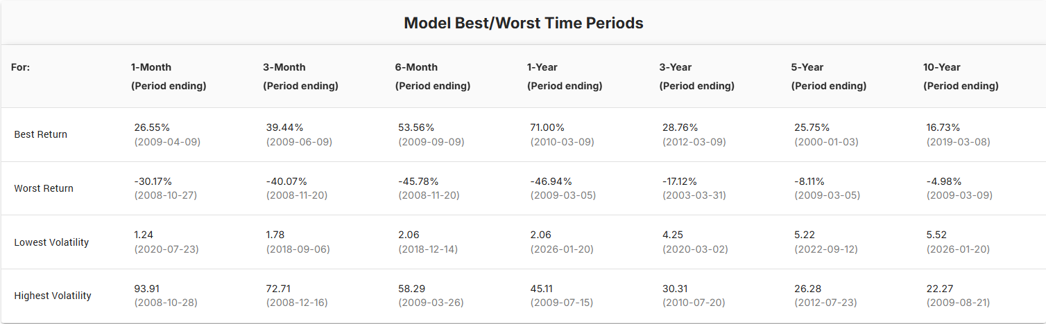 When setting the target volatility, it’s helpful to review shorter-term volatility measures (such as 1-year, 3-year, and 5-year), as well as historical worst-case periods. See below.