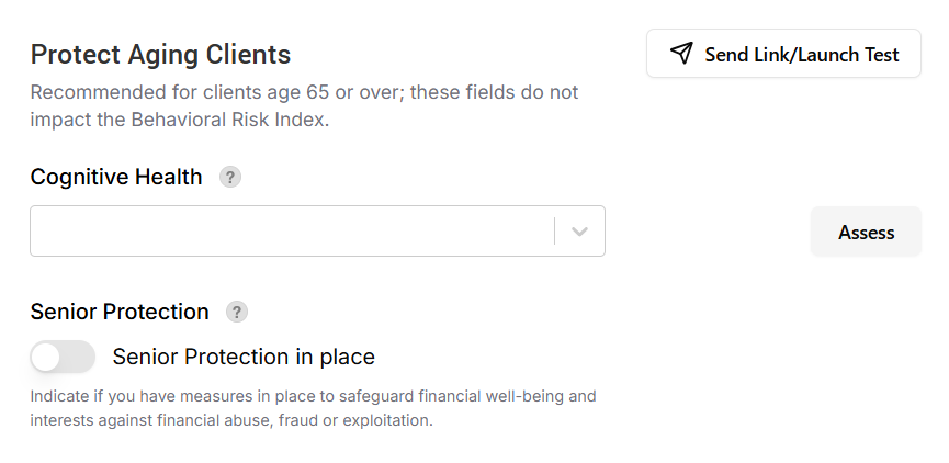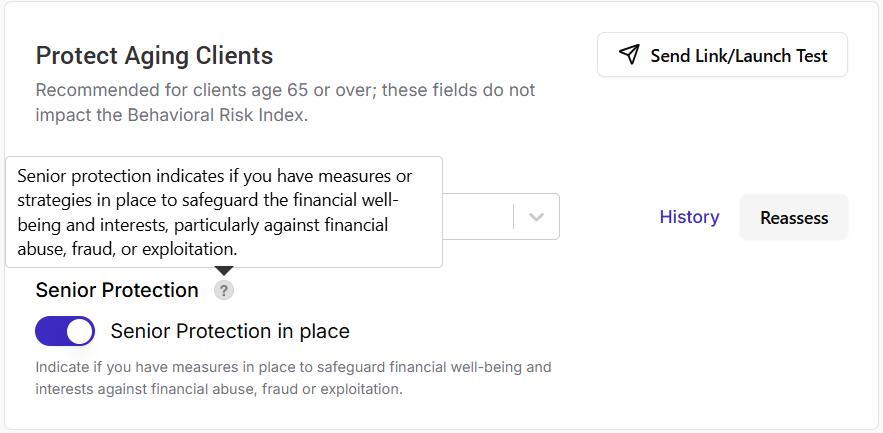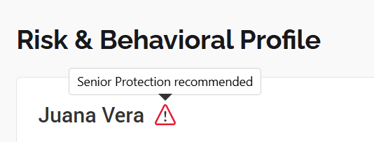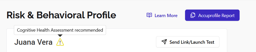 If the client is aged 65 or older but has not taken the Cognitive Ability Test, you will see a yellow alert icon next to their name on the Risk & Behavioral Profile page. When you hover over it, a tooltip will indicate that the Cognitive Ability Test is recommended.