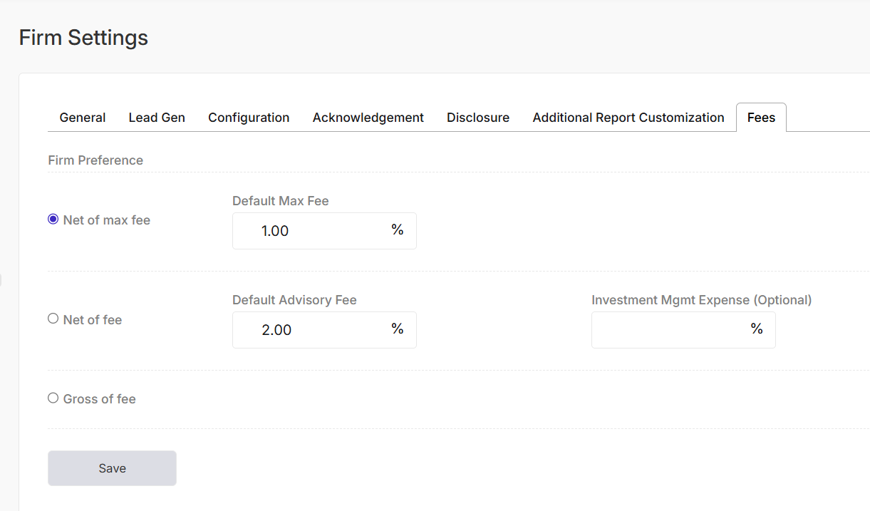 There are three options to choose from: Net of Max Fee, Net of Fee, or Gross of Fee. Select the option that best suits your firm's fee structure.