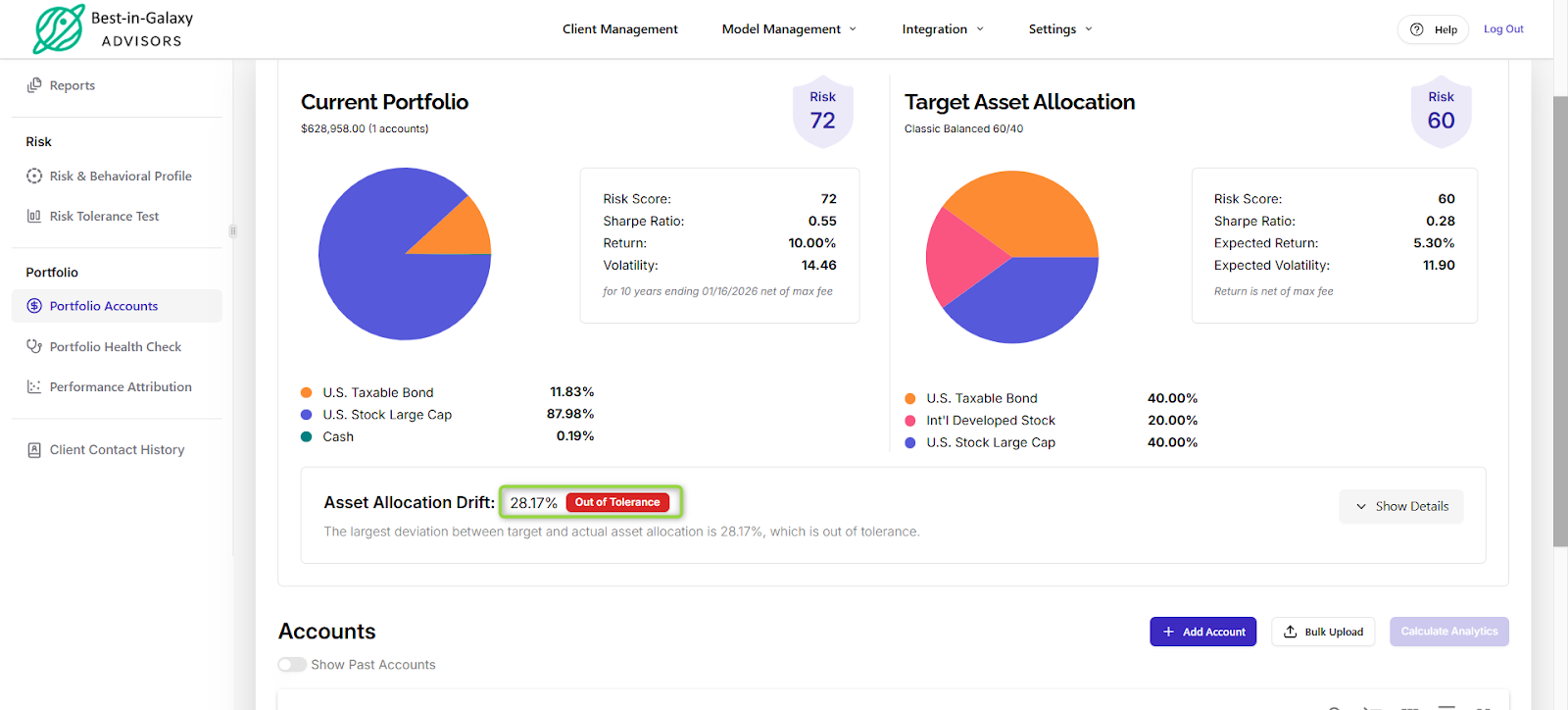 The Portfolio Accounts Overview shows all accounts used in the asset allocation calculation and can also be used to help troubleshoot any issues.