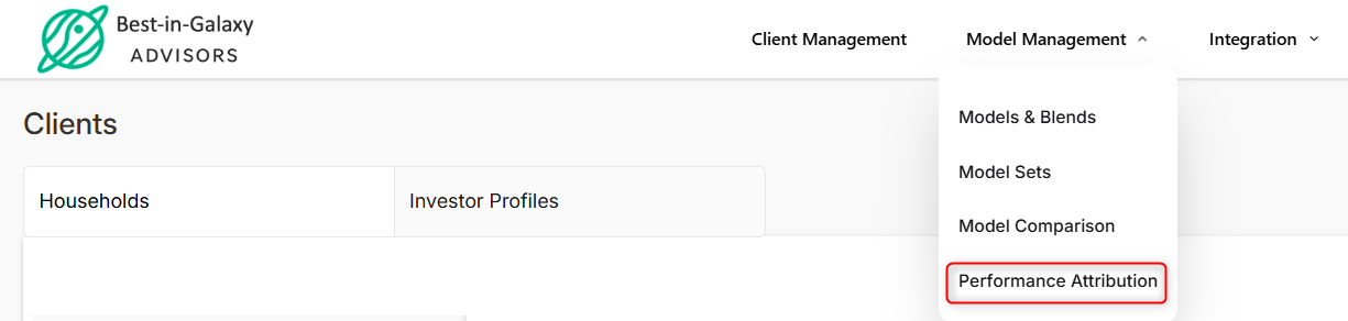 It is also accessible from the Model & Blends page → Performance Attribution button.