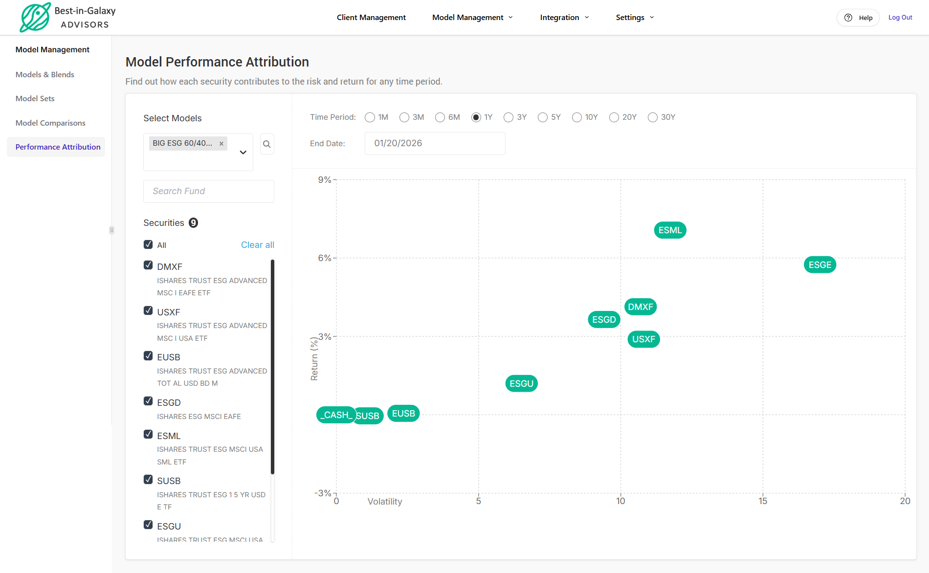 Model Performance Attribution shows how each security contributes to overall risk and return for a selected time period. This feature allows you to analyze the performance of all securities within a model and identify which ones are performing well.