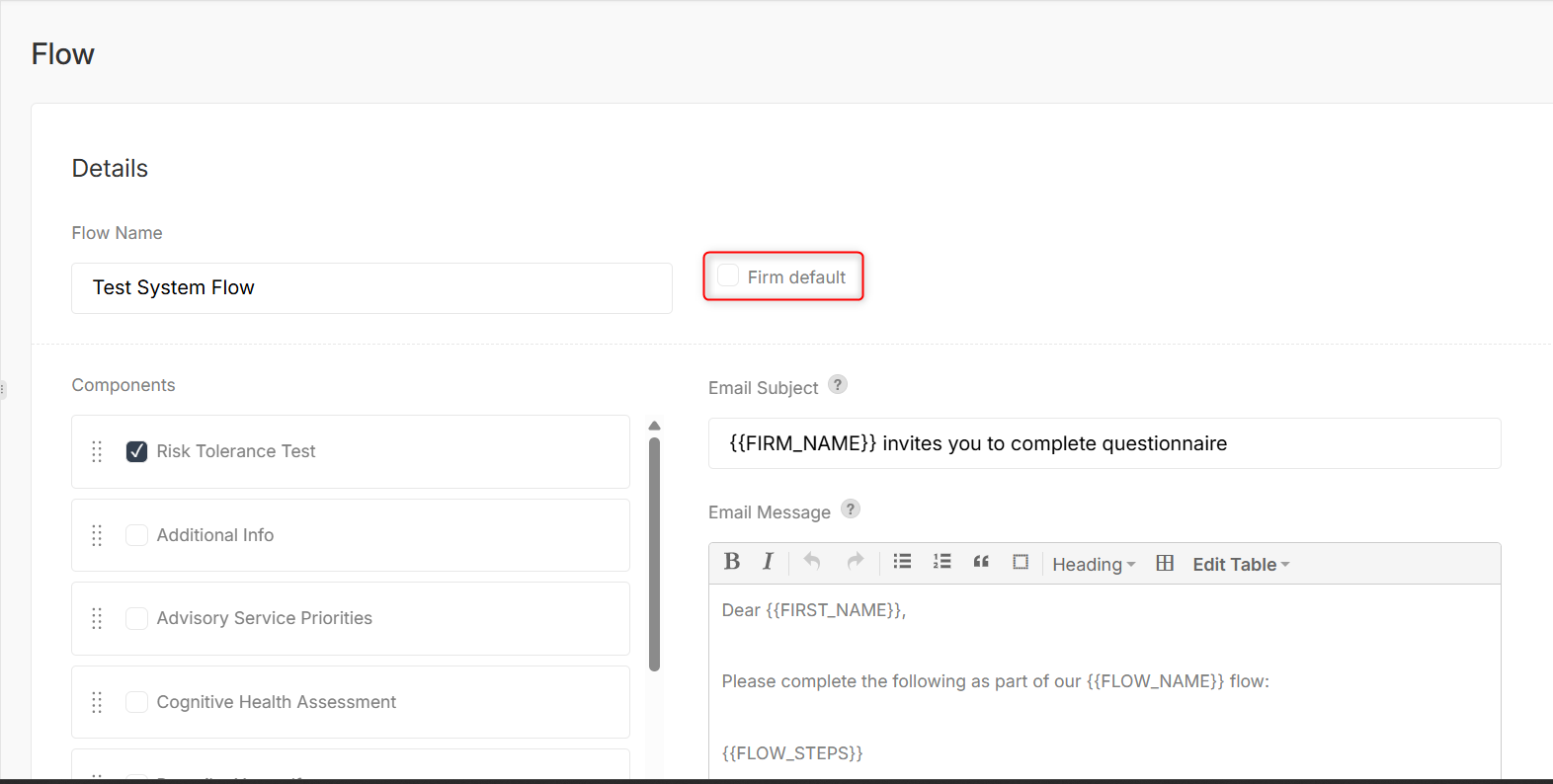 3. Click “+ Add Flow,” enter the flow name, and select the desired components (questionnaires).